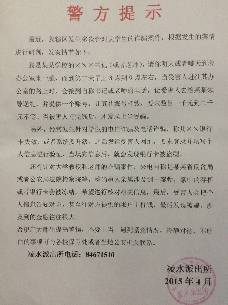 希望广大师生提高警惕,不要上当,遇到紧急情况,冷静对待,不明白的事项可与各校保卫处或者当地公安机关联系。