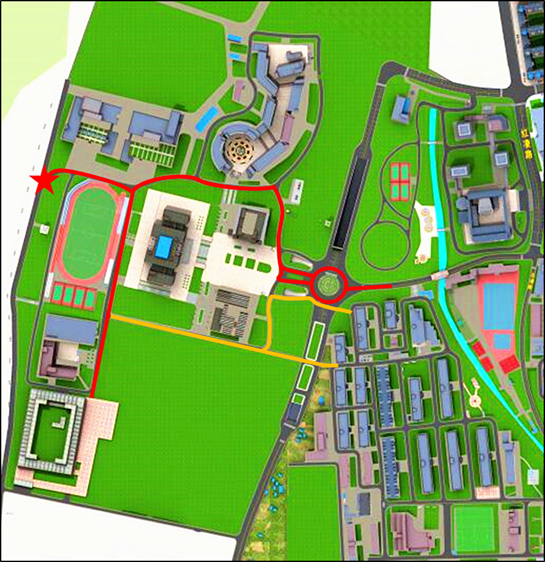 3.通行路线:西部校区规划车辆专用道(下图中红色路线)和行人专用道(下图中黄色路线),红色、黄色路线道路两侧禁止停车,西部校区各单位车辆可停放在西部校区地下停车场。