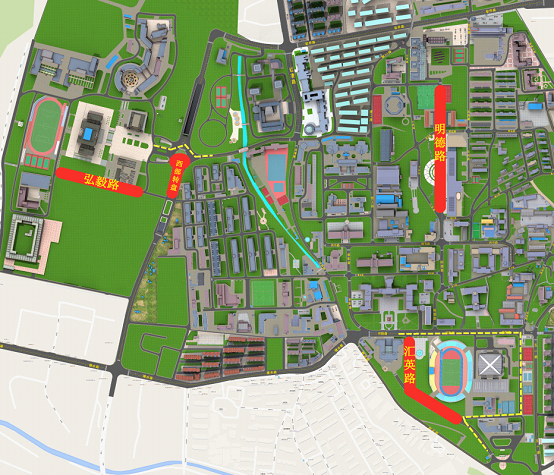 因2020级、2021级本科生军训时间调整,现将明德路、汇英路部分路段封路时间调整为9月13日8时30分至17时、9月14日至9月21日每天8时至17时。弘毅路、西部转盘区域按原通知封闭。