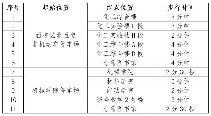 根据前期调研与测算,调整后从各点位步行至西校区相关楼宇的时间大致为2至5分钟,具体情况如下表所示: