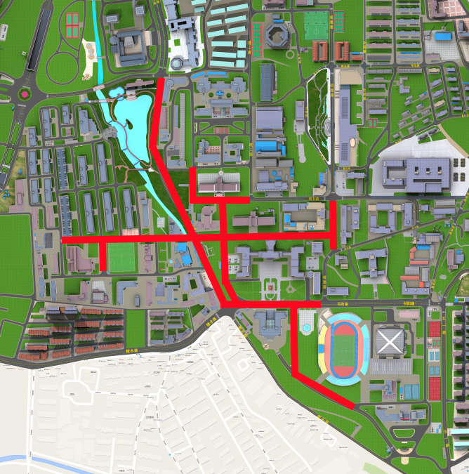 (五)5月24日6时至22时对活动举办区域道路进行封闭(如下图)。上述路段封闭期间禁止一切非机动车、机动车通行,活动当日老北门临时开放,车辆可由老北门进出。