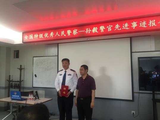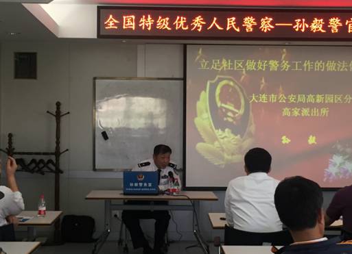 报告会上,孙毅警官分享了“立足社区做好警务工作的做法体会”,他认为,只有把辖区每一户居民的情况摸熟摸透,才能成为一名称职的社区民警。孙毅警官运用自己总结的“自我推介法”、“错时法”、“预约法”等工作方法,把辖区2300多户常住人口一个不漏地全部走访一遍,大大降低住了各类案件的发案率。在走访的过程中,孙毅发现“手抄脑记”的老办法既不利于统计,又不方便查询。他自费买了一台二手笔记本电脑,将辖区的各种信息以“图表、图文、图像”的形式存储在电脑里,并不断补充更新资料,成为了辖区情况的“活地图”。