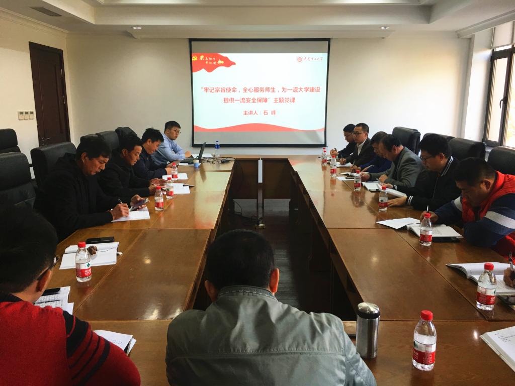 会议首先进行“牢记宗旨使命,全心服务师生,为一流大学建设提供一流安全保障”主题党课学习。主讲人石峰分别从“守初心,坚信仰,坚决对党忠诚;担使命,严纪律,弘扬优良作风;找差距,明不足,密切联系师生;抓落实,强服务,建设平安大工”四个方面向同志们做了专题讲授,并联系实际向大家提出了作为高校保卫干部的具体职责和要求。