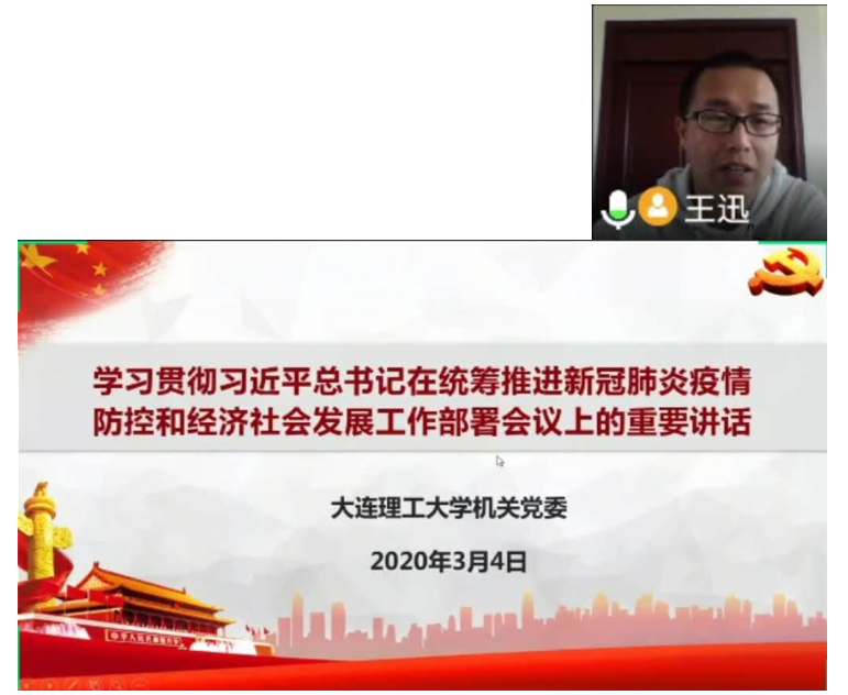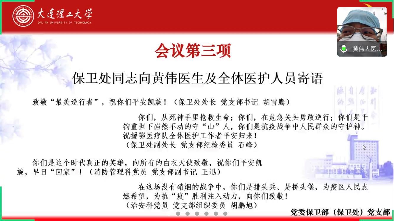 3月28日下午,保卫处党支部通过线上视频会议举行疫情防控主题党日活动,会议远程连线大连医科大学附属一院驰援武汉雷神山医疗队的黄伟医生,并集中组织党员学习贯彻习近平总书记在统筹推进新冠肺炎疫情防控和经济社会发展工作部署会议上的重要讲话。本次党日活动为全体同志开设了一堂“特别”的党课。
