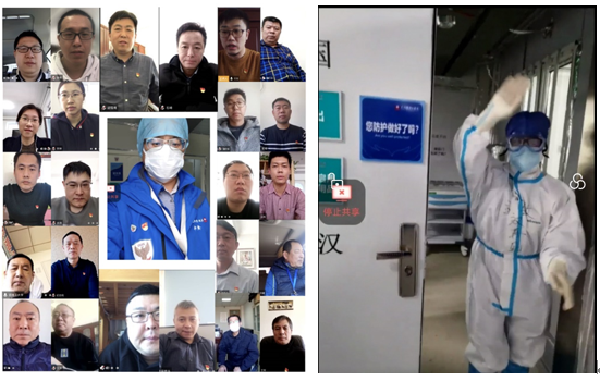 视频会议中,全体同志共同观看了震撼人心的辽宁支援武汉雷神山医疗队视频宣传片——“雷厉风行,使命如山”,感受到了医疗队全体成员抗击疫情的信心和决心。随后连线邀请即将胜利返连的黄伟医生为全体参会人员直播了武汉雷神山医院的工作实景。连线期间,全体同志共同见证了一名白衣天使自清洁区走进隔离区大门的瞬间。医护人员向同志们挥手告别,护目镜下是她坚定和勇敢的眼神。黄伟医生表示,辽宁医疗队中他所负责的病区,抵达雷神山医院当天就接到了满员接收38名患者的艰巨任务,但是作为医务工作者他们责无旁贷,有党中央的坚强领导和人民群众作为坚实后盾,他们定会全力以赴、不负众托,做好人民群众生命安全的坚定守护者。