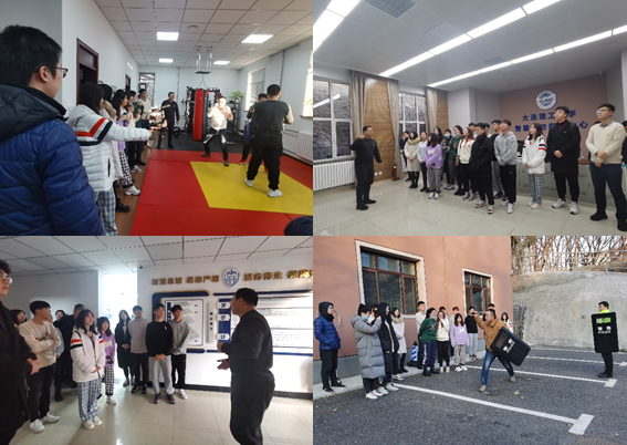 座谈之后保卫处党支部组织委员胡鹏旭带领大家一同走近真实的保卫工作。第一站,来到保卫处三楼警体训练室体验“警体训练真武力”,武警出身的安保班长为大家演示讲授日常防范和逃脱技巧。第二站,走进“平安大工指挥部”,参观一楼智慧安防指挥中心,了解校园技防建设与指挥调度流程。第三站,前往保卫处门前空地,开展防恐防暴器械演练,模拟“岗位练兵进行时”。