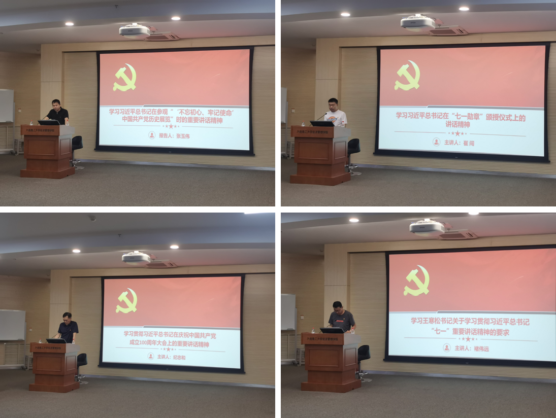 开展集体学习,张玉伟带领全体同志学习习近平总书记在参观“‘不忘初心、牢记使命’中国共产党历史展览”时的重要讲话精神,崔闯解读习近平总书记在“七一勋章”颁授仪式上的讲话精神,纪忠和号召全体同志深入学习领会习近平总书记在庆祝中国共产党成立100周年大会上的讲话精神,褚伟远传达了王寒松书记关于学习贯彻习近平总书记“七一”重要讲话精神的要求。同志们在学习“七一”重要讲话精神后,纷纷表示作为共产党人要牢记初心使命,坚定理想信念,践行党的宗旨,将学习成果转化为服务师生的实际行动。