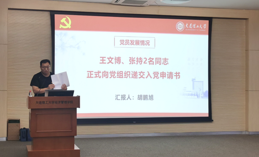 坚持做好党员发展工作,支部组织委员胡鹏旭向支部大会通报了关于接收王文博、张持入党申请的相关情况。