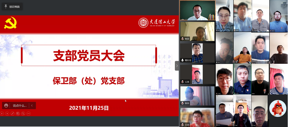 11月25日下午,根据大连市疫情形势,保卫处党支部通过腾讯会议召开线上党员大会,开展党章专题学习、先进典型教育、集体学习,全体同志参与会议。