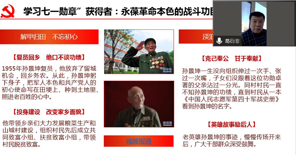学习先进典型“七一勋章”获得者孙景坤,观看视频报道,退役军人葛衍非讲述孙景坤“三渡鸭绿江”“决战161高地”向死而生的战斗故事,以及复员回乡后克己奉公、甘于奉献、绝口不提功绩的英雄本色,号召全体同志向永葆革命本色的战斗功臣孙景坤学习,心里想着党、想着国家、想着人民。