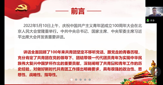 坚持专题党课讲授不停歇,许多同志以“深入学习习近平总书记在庆祝中国共产主义青年团成立100周年大会上的重要讲话精神”为题讲授党课,带领全体同志全面回顾100年来共青团坚定不移听党话、跟党走的青春历程,深刻学习共青团和青年工作的宝贵历史经验,重温习近平总书记对新时代中国青年的殷切期望,领会习近平总书记对各级党组织在青年工作中的严格要求,同时,许多号召全体同志深刻领悟讲话的核心要义,真正当好青年朋友的知心人、青年工作的热心人、青年群众的引路人。