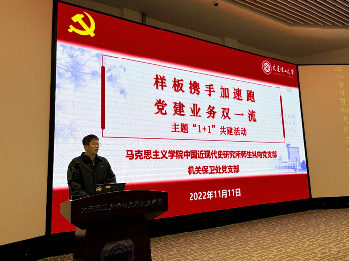 为深入学习宣传贯彻党的二十大精神,推进“一融双高”建设,深化“样板支部”交流互鉴,11月11日上午,机关保卫处党支部与马克思主义学院中国近现代史研究所师生纵向党支部举行“样板携手加速跑、党建业务双一流”主题“1+1”共建活动。活动由保卫处党支部副书记王迅主持。