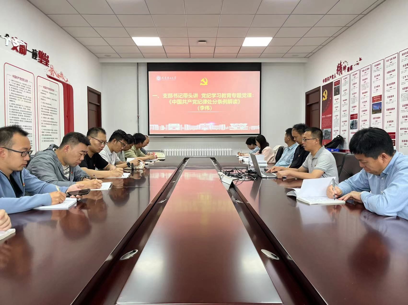 活动第一项议程为扎实开展党纪学习教育,由支部书记李伟作《中国共产党纪律处分条例》解读。李伟从政治纪律、组织纪律、廉洁纪律、群众纪律、工作纪律、生活纪律六方面逐条进行解读,并要求全体党员同志认真学习、对照检查,以新修订的纪律处分条例为准绳,并于会后持续开展自学。