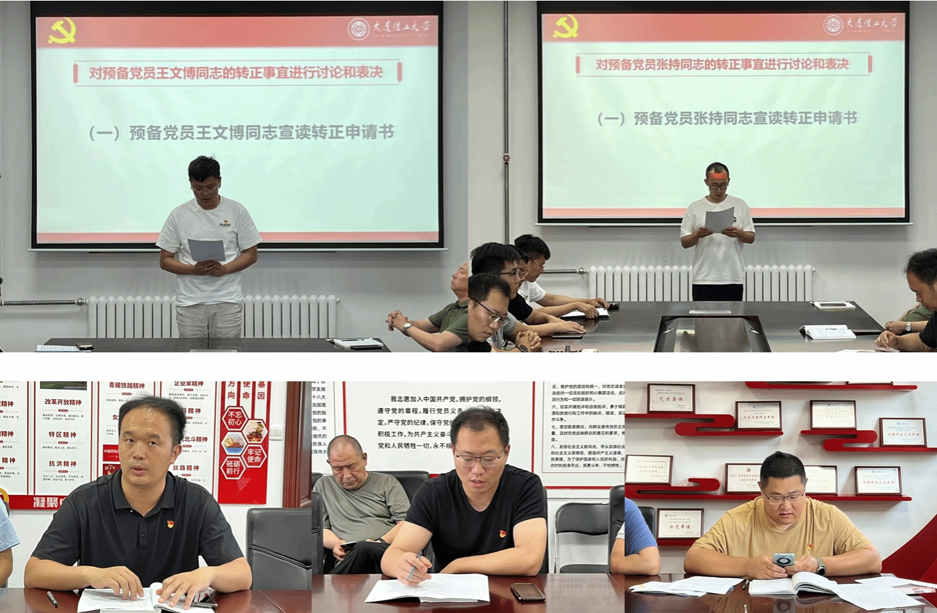 首先进行预备党员转正大会。预备党员王文博、张持分别宣读转正申请书。入党介绍人高文、胡鹏旭、帅涛分别介绍转正申请人主要情况,表示同意两位同志转正。与会党员张音、贾云龙、于波、陈凡分别对两位同志进行评议并表示同意其转正。全体党员通过无记名投票方式进行表决,表决结果一致同意两位同志转正。支部书记李伟宣读王文博、张持转为正式党员的决议,待上报上级党组织批准后生效。
