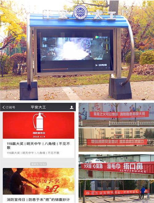 消防安全,预防为主,重在宣传。今年“11·9”期间,保卫处积极利用多种宣传渠道,在主校区、市内校区、开发区校区同步开展立体化消防安全宣传。在三个校区主要路段悬挂宣传标语,提醒师生关注消防安全;依托“平安大工”微信公众号、i大工APP等新媒体宣传平台,接连发布消防安全图文推送;在“平安大工”电子宣传栏滚动播放消防安全宣传教育视频;积极营造消防安全宣传氛围。