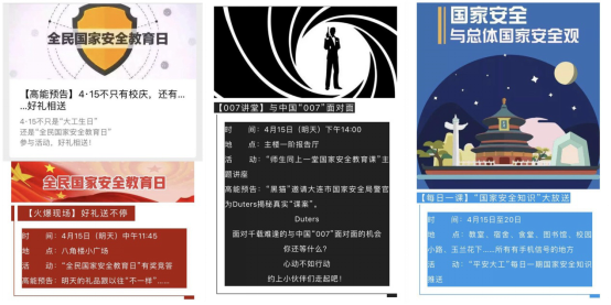 4月15日至19日,“平安大工”微信公众号先后发布4期图文推送,让互联网成为宣传“总体国家安全观”的大讲堂。在每周一的《校园警情通报》栏目,推出《揭秘真实“谍案”》提醒,以近年来国内发生的真实间谍事件,提醒广大师生保持清醒、提高警惕,严守国家秘密,并在推送最后发布“国家安全知识竞答”,寓学于乐,以赛促学。《聚焦·全民国家安全教育日》、《精选·十九大的“安全观”》、《问答|你会泄露国家秘密吗?》等推送主打国家安全知识的宣传普及,向师生系统解读“全民国家安全教育日”的由来、国家安全的范畴、大学生维护国家安全的做法等问题。
