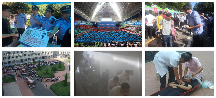讲座结束后,保卫处联合相关部门在西山生活区和开发区校区同步开展了消防安全演习,2019级全体新生和部分教职工共计6000余人参加。演习包括模拟火灾烟雾环境(放烟),组织学生疏散逃生;讲解火灾疏散要领,灭火器、消防栓使用要领,并现场进行灭火器演练;救援被困人员,对伤员进行初步救治。演习流程清晰、全员配合紧密,达到预期效果。通过学习培训和实际演练,同学们提高了安全防范意识,掌握了面对突发火情的应急逃生自救技能。