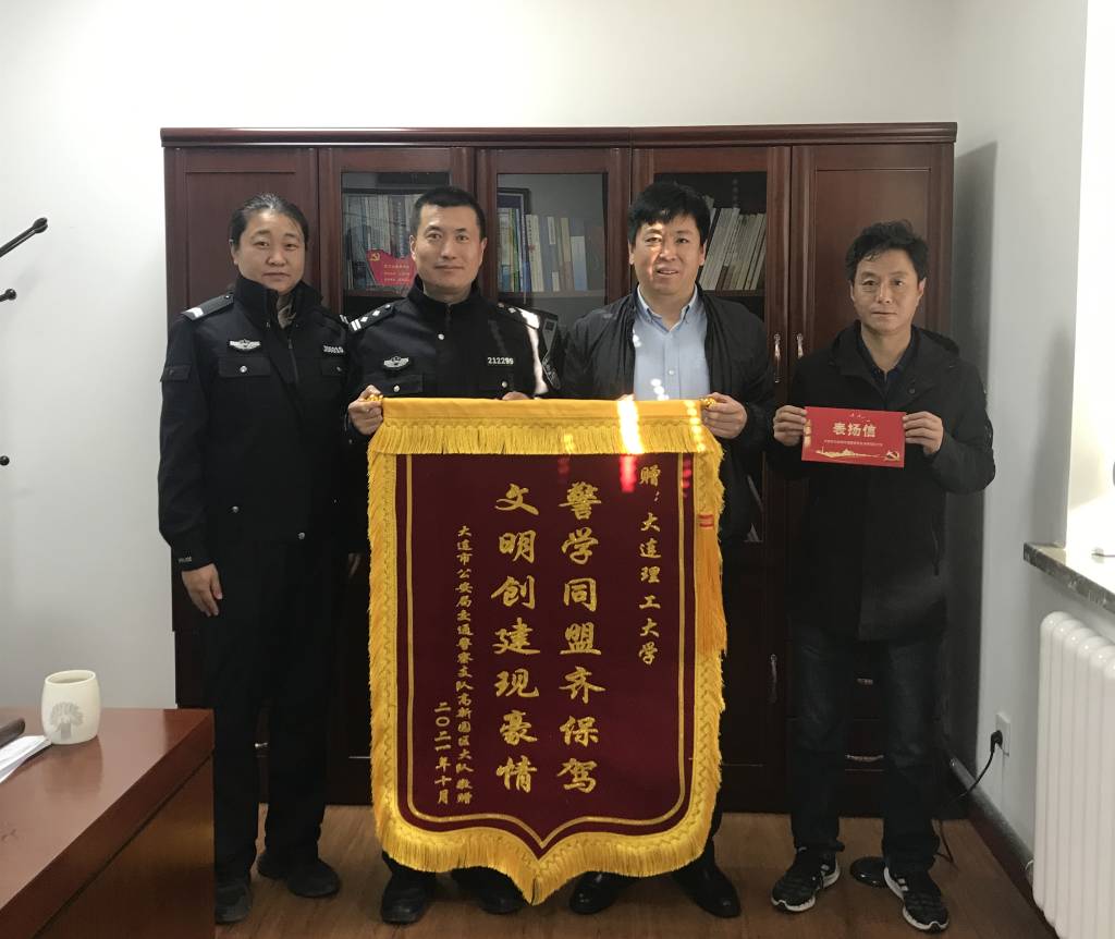 11月4日下午,高新园区交警大队副队长张春雨一行向我校保卫处送来“大连市文明城市创建”的锦旗和表扬信,保卫处处长胡雪鹰及相关同志接待来访。
