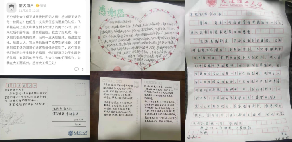 自校园严格封闭管理以来,保卫处共接处报警求助140余起,连夜查找视频监控、数小时涉水寻找手机……被同学们称为“大工师生最值得信赖的坚强保障力量”。11月20日,保卫处110接处警室接到同学求助,称14日挂在伯川图书馆楼后树上的无人机丢失,由于具体丢失时间未知、监控拍摄角度不佳,智慧安防指挥中心的刘阳通宵查看附近点位监控视频,最终为同学追回丢失无人机。11月15日,一位同学脚踝错位需要紧急救援,保卫干部胡鹏旭、王文博第一时间赶到宿舍,联系校医院和辅导员,为同学申请紧急出校就医,巡逻队员迅速清除门前车辆,引导救护车顺利进出校园。