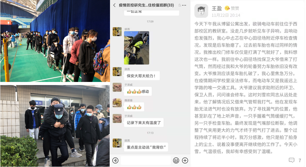 核酸检测现场,安保队员驻守在每一个关键点位,维护现场秩序,保障近20万人次师生顺利完成核酸检测。“同学们的事儿都是大事!”在接到受伤同学求助后,巡逻队班长董宇主动接送行动不便同学,并同现场工作人员和排队同学征求同意,为行动不便同学开通绿色通道,董班长的肩膀成为了同学们的温暖依靠。“没事,都是小事儿!”这是巡逻队员刘雪欢收到感谢信后说的话。11月22日,小雪,他看到一位同学因电动车车胎漏气无法前行不知所措,他趴在地上近半小时帮同学找到了漏气的位置,让同学在寒冷的冬天感受到了大工的温暖。每一名安保人员坚守岗位,守护平安,被同学们称为“可爱的人”。