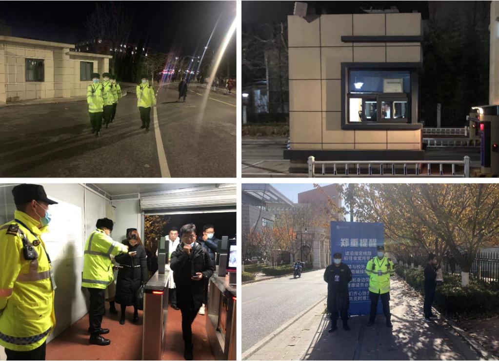 为把好校园第一道安全关卡,各门岗保安员24小时全员执勤,被同学们称赞为“始终冲在第一线的战士”。南门、新北门是校园封闭管理后物资保障车辆进出的门岗,执勤人员严格审查每辆进校车辆、每位进校人员,做好每日门岗消杀,切实把好校园入口关。到了夜晚,尽管气温下降天气寒冷,门岗执勤人员依然坚持开着窗户以便更清晰地视察门岗情况。学校封闭管理后,校内学生活动大幅增多,巡逻队加大巡逻力度和频次,保障第一时间处置紧急情况。夜晚全员备勤,防范处置违规翻越进出校行为。北山研究生前往食堂的路上,保卫干部带领保安人员员一路充当“人墙”,将同学们与外界危险阻隔开来。