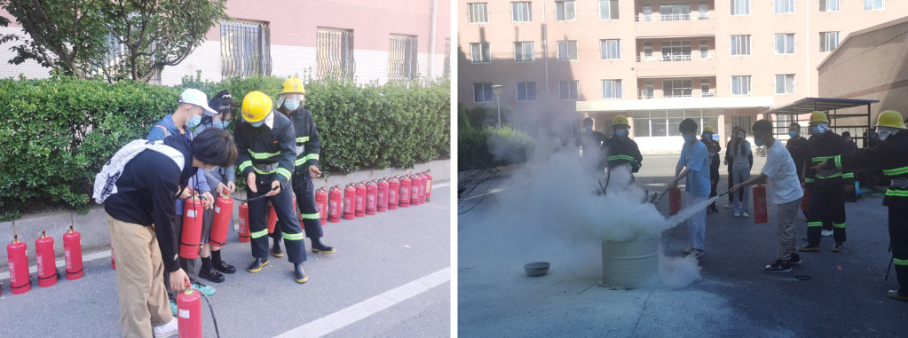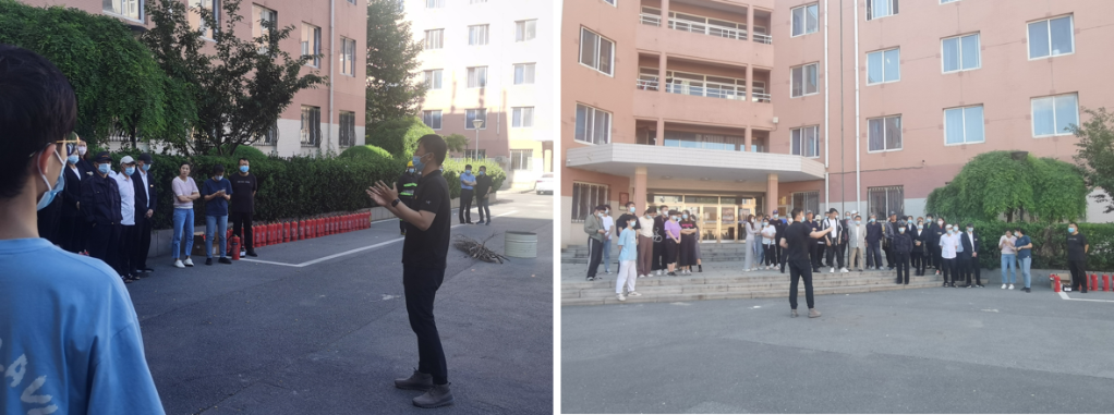 面向同学们和宿舍传达员的实景教学在20舍广场上开展。以宿舍内电吹风引发火灾为例,保卫处工作人员对宿舍防火、火情处置、紧急疏散等事项进行详细阐释:提示同学们注意宿舍用电规范,认真学习掌握消防知识,遭遇火情时首先要保持冷静,在保障自身安全的前提下扑救初起火灾,同时通知传达员并拨打火警电话,一旦火势无法控制,立即疏散逃生;教授宿舍传达员火灾处置“三步走”,一是发现火情迅速断电、快速查看处置火情,二是出现火情务必报告保卫处、火势较大要立即报警,三是第一时间打开宿舍所有安全通道、快速有序组织人员疏散。