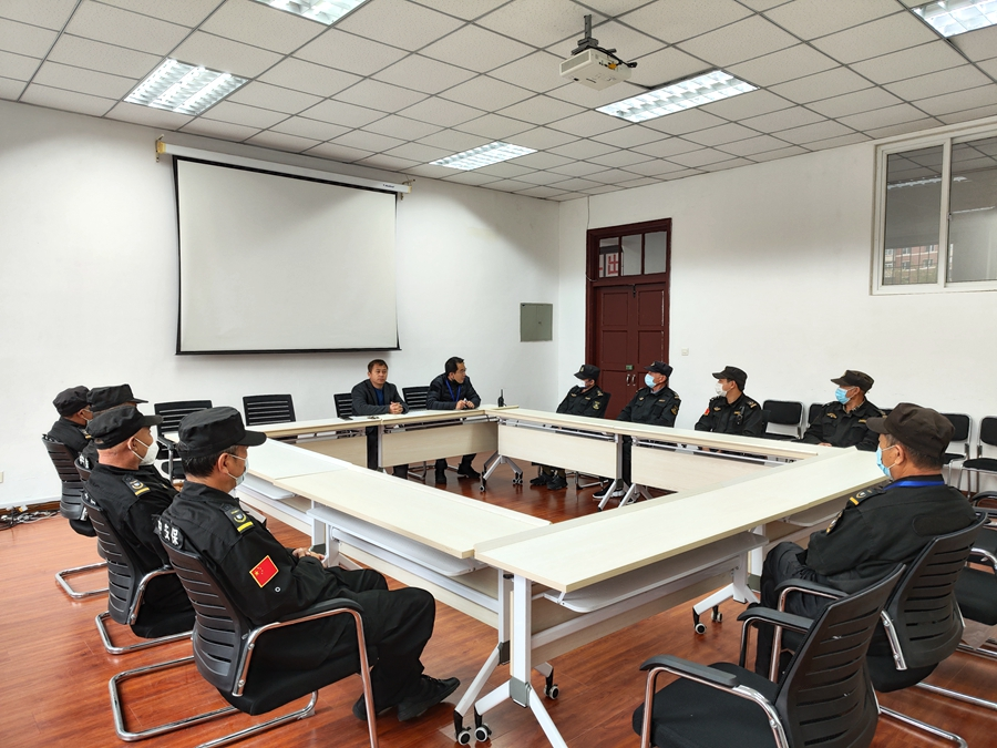 首先,保卫科张同国老师宣读了最新修订的《市内校区校园门卫岗位职责》,并结合实际案例,对门岗值勤工作处置流程进行详细解读,明确各类人员和车辆出入校园时的规范化处置程序。张玉伟科长对物业保安员提出四点工作要求:一是对各项工作制度做到牢记于心,在工作中严格落实,切实提高管理和服务水平;二是内强素质、外树形象,做到文明执勤、热情服务;三是提高安全防范意识和敏感性,坚持做好校园的巡查工作,及时发现各类安全隐患;四是高度重视疫情防控工作,严格执行查验“两码”、扫“场所码”等防控措施,保证校园的防疫安全。