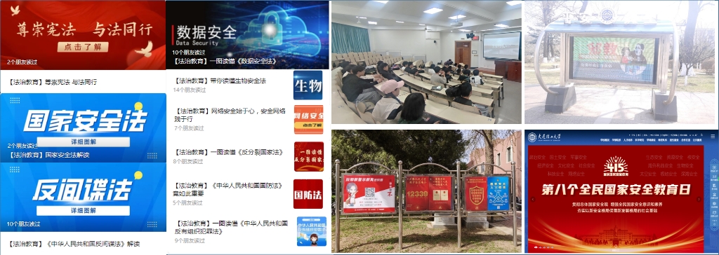 深化国家安全法治教育,依托“平安大工”微信公众号推送“每日一法”,普及宪法、国家安全法、反分裂国家法、国防法、反恐怖主义法、数据安全法、生物安全法、网络安全法、反间谍法、反有组织犯罪法等法律法规知识。开展反邪教警示教育,通过校内电子宣传屏、宣传栏等载体宣传警示教育片及主题海报,引导师生关注“中国反邪教”公众号,增强师生防范邪教能力。