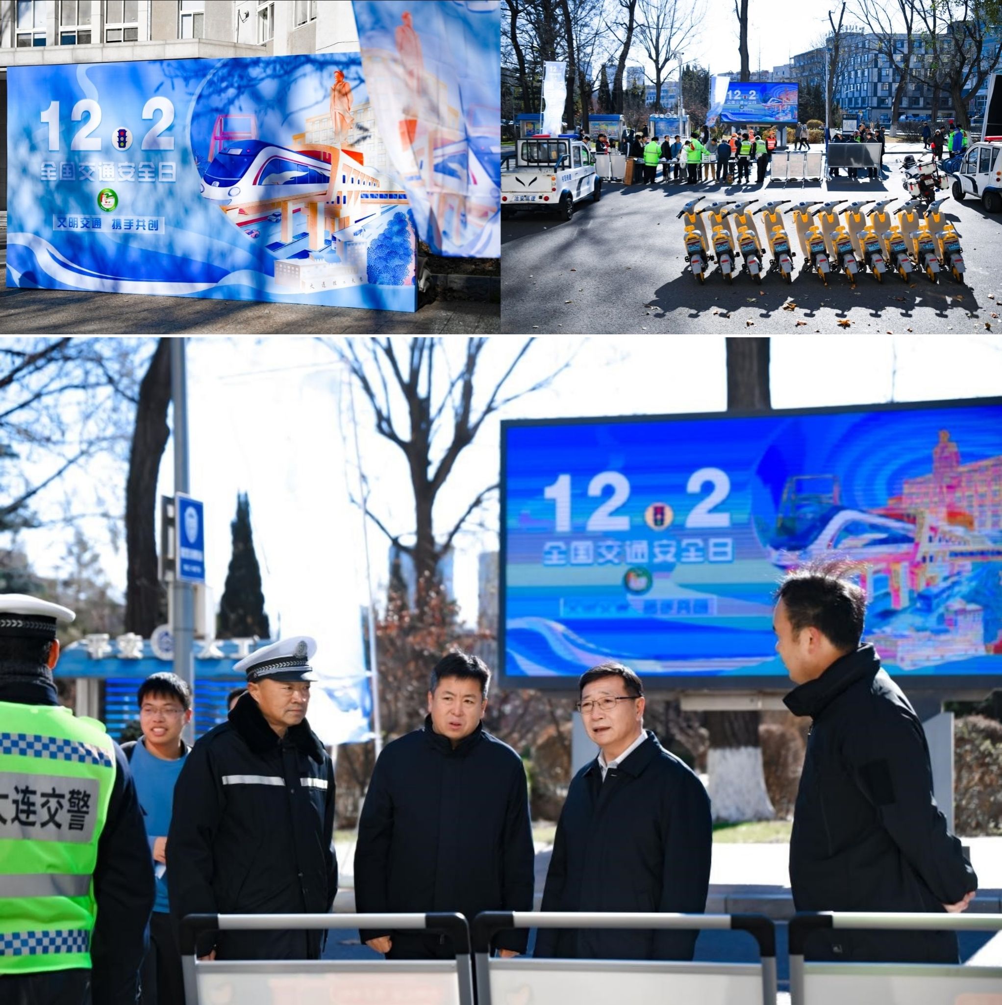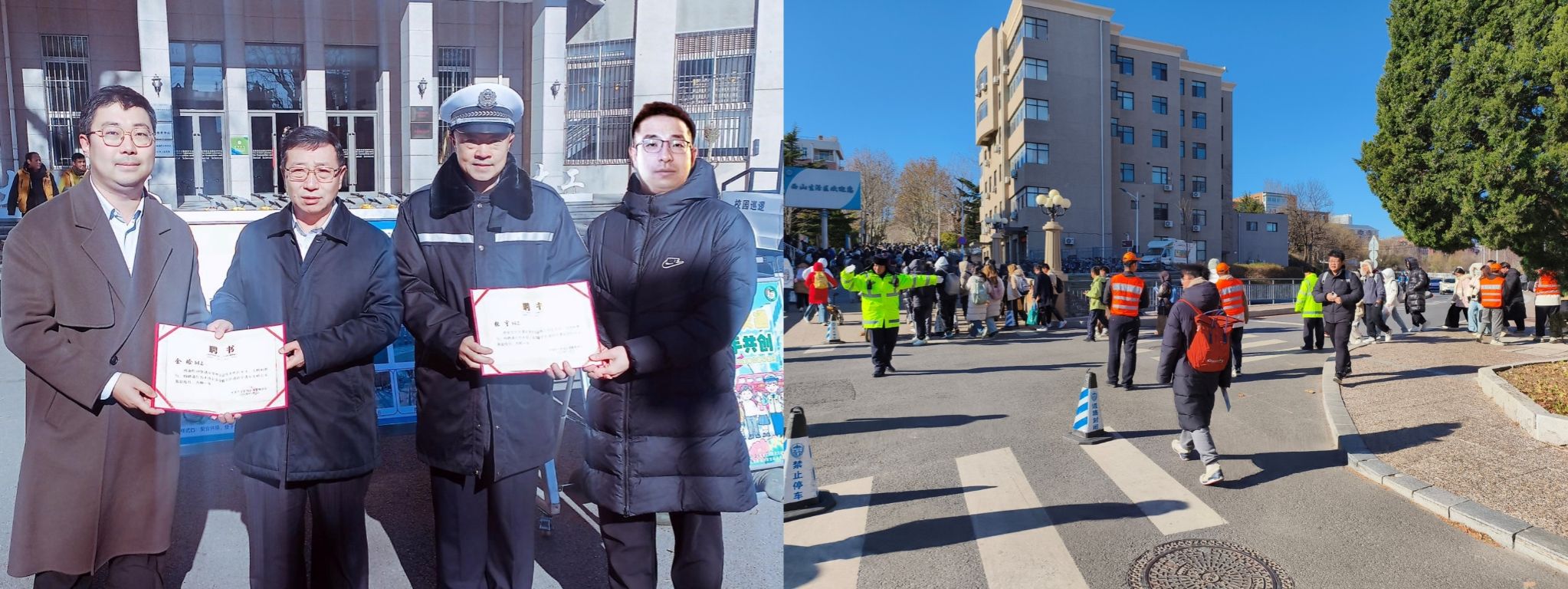 当日,在西门十字路口设置了交通护学志愿岗位,大连市公安局交通警察支队聘任金晗等7名师生为大连市公安交警支队道路交通安全社会义务宣传员,在校内开展校园交通安全宣传。12月2日起,志愿者与保卫干部一同开展交通组织和引导,守护高峰时段师生安全,协同共创校园文明交通氛围。