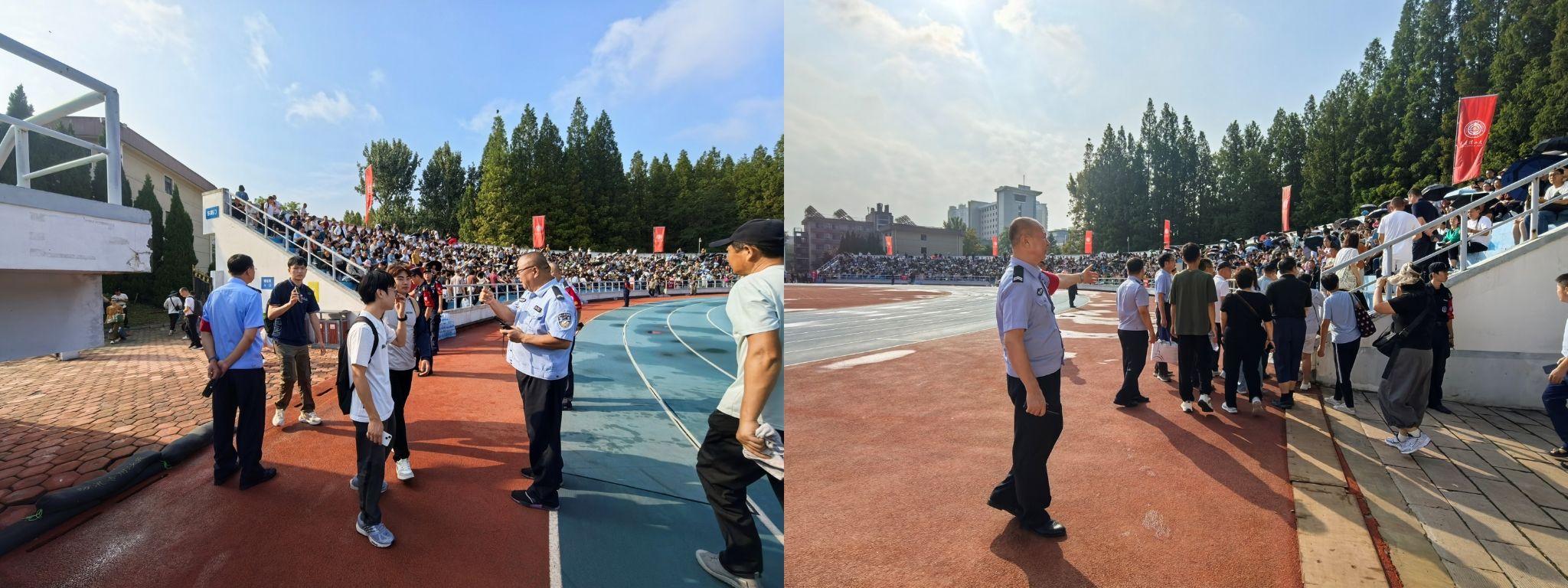 9月1日,新生开学典礼如期举行,近4000名家长前往观礼。保卫人员提前守候在体育场各出入口、场内重要部位及周边道路,引导新生及家长有序入场,维护场内秩序,确保散场前后人流密集时的交通安全,保障新生开学典礼顺利举办。
