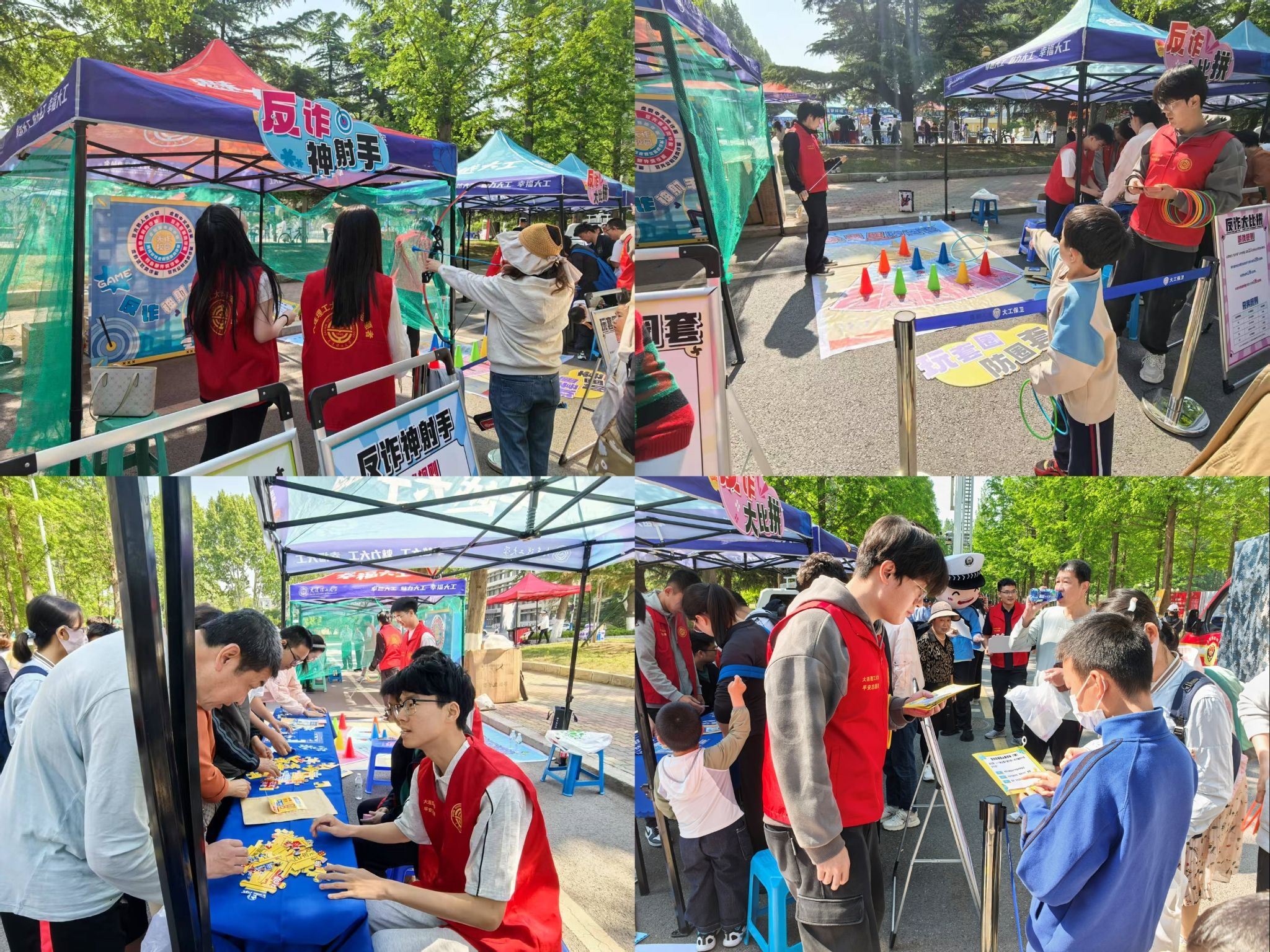 清早,反诈游戏区便排起了长队。本次反诈趣味游戏将反诈问答与射箭、套圈、拼图等游戏相结合,通过积分通关的方式赢取反诈定制奖品,提升了师生参与度。