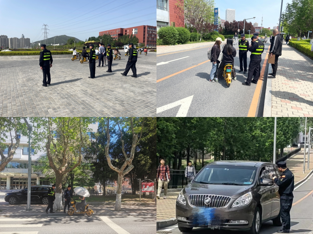 5月14日起,持续一周开展交通秩序集中整治排查。上下课高峰时段,在校园重点路段重点检查纠正非机动车和机动车的各类不文明交通违规行为。劝阻非机动车逆行、道路中央骑行、载人骑行、玩手机骑行等违规行为,及时拦截下坡路段骑行速度过快的师生,教育提醒机动车车主不打转向灯、不礼让行人、鸣笛等不文明行为。5月10日的安全检查中,针对骑行载人、骑行玩手机等违规行为共计劝阻31人次。