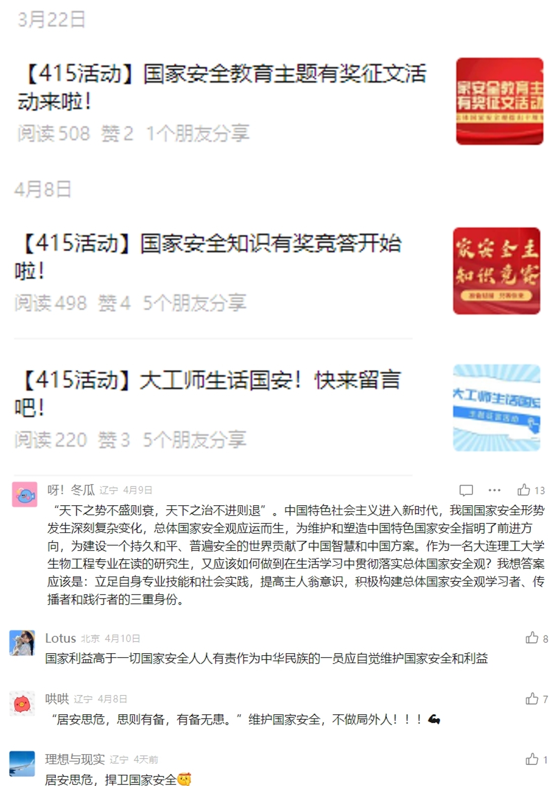 培育一批活动品牌,国家安全教育主题征文、“大工师生话国安”主题征言、线上竞答等活动吸引众多师生踊跃参与。“居安思危,思则有备,有备无患。维护国家安全,不做局外人!”同学们的留言彰显了大工学子维护国家安全的坚定决心和责任担当。