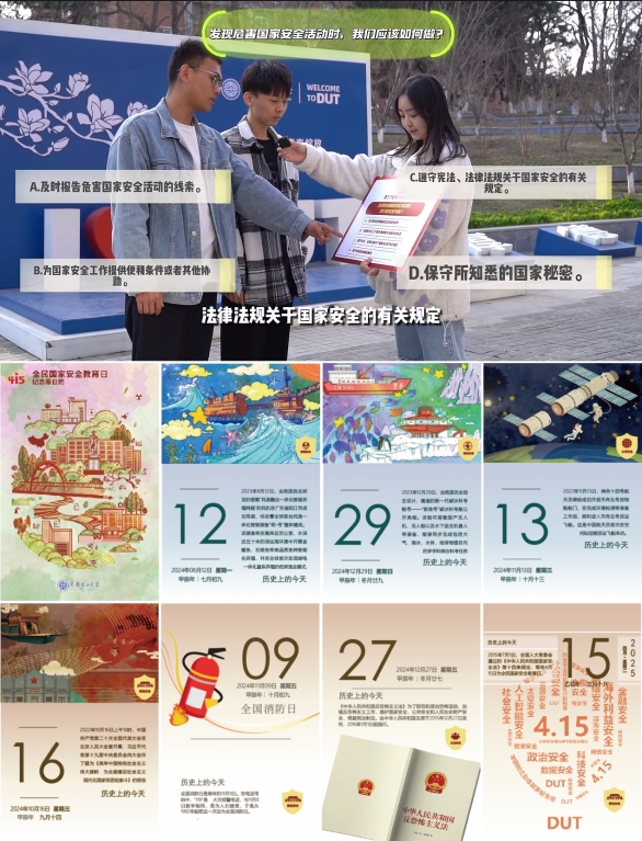 摄制“国家安全知多少”创意视频,遴选学校各单位师生代表作为总体国家安全观宣讲团,以问答形式讲授国家安全知识。推出全民国家安全教育日纪念版日历,由大工学子设计手绘,融入国家安全发展历史和相关诗句,每日同步推送“历史上的今天”主题视频。
