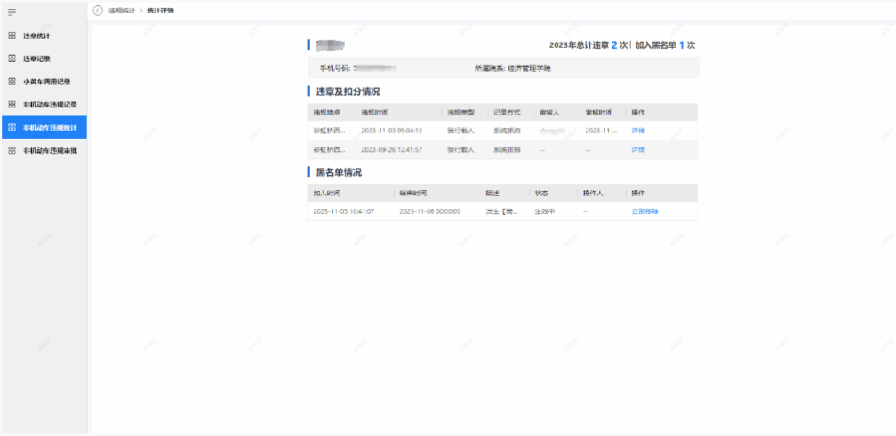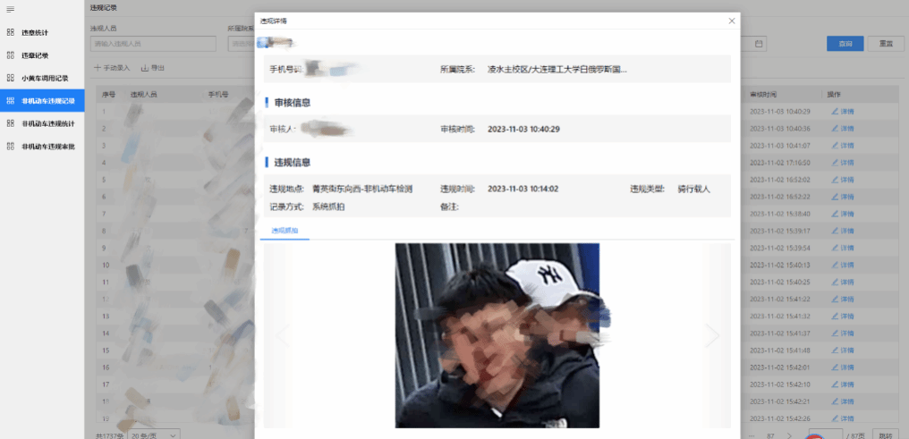违规信息将汇总至管理平台,平台可根据人员信息进行扣分并联动短信提醒,同时限制骑行。