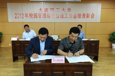 校党委副书记、纪委书记李成恩代表大连理工大学校园管理综合治理委员会与国家示范性软件学院、国际教育学院、机关党委等二级单位的综治责任人代表签订了综治工作承包责任状。