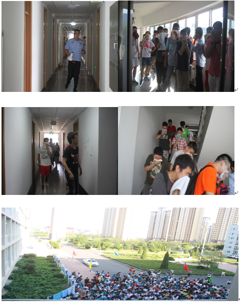 接下来演习开始,随着一阵急促的哨音响起,立即启动疏散预案,公寓管理员第一时间做出断电处理,全体学生在老师的引导下,用湿毛巾、衣物等捂住口鼻有序从寝室跑到中心广场上的指定位置,同时公安科两名保卫人员手持灭火器第一时间赶到火灾现场进行扑救。不到六分钟,全楼百余名师生从公寓楼安全疏散到广场。