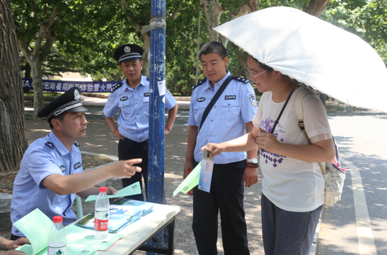 在活动现场,最受师生围观追捧的要数驻校民警。长期的校园案件侦办经历,让无数的小偷在他们面前栽了跟头。面对师生关心的如何提高安全防范能力的问题,这些专业的安全防范高手现场传授防盗、防骗、防抢绝招,并向过往师生发放防范知识宣传单。提醒广大师生提高防范意识,注意财物安全。