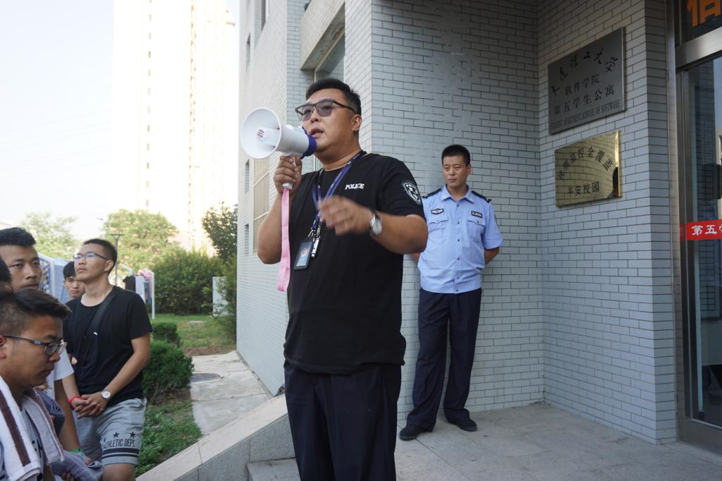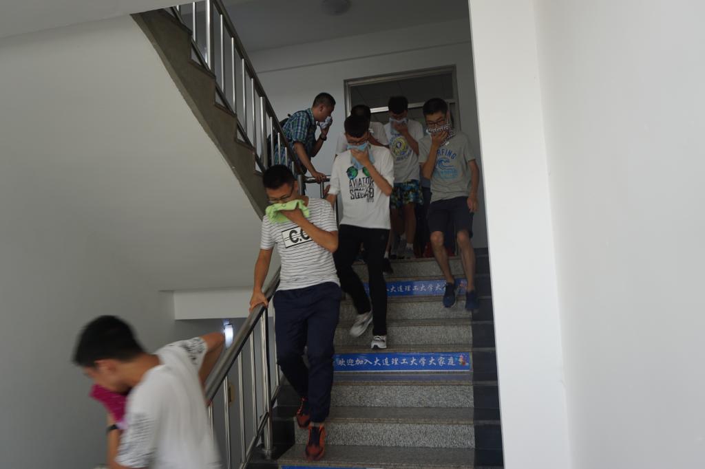 首先由开发区校区公安科科长孙明进行演练前动员及演练流程注意事项及治安、消防等知识;随后演习正式开始,火情发生在理工大学软件学院宿舍区5号宿舍楼3层311室,当时整个楼大概有100多名学生正在休息,发生火灾后,公安科科长吹响警笛示意学生立刻有秩序的进行逃离现场,公安科人员迅速奔向火场进行扑救疏散学生,学生在老师的组织下,拿着毛巾低着头有秩序地从两侧临廊撤离到安全地带,整个演练结束用时四分钟。本次消防演练,增强了新生的安全防范意识,提高了同学们防火、逃生自救的基本常识和技能水平,同学们在日常学习中时刻牢记消防安全,做到未雨绸缪,防患于未然,深刻认识掌握消防安全知识的重要性,为创建安全和谐校园打下坚实基础。
